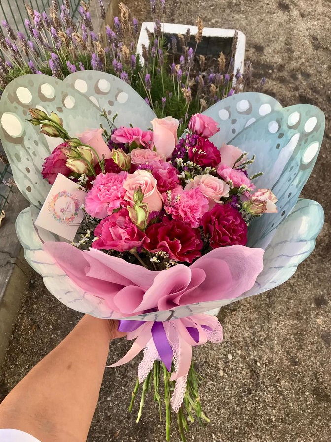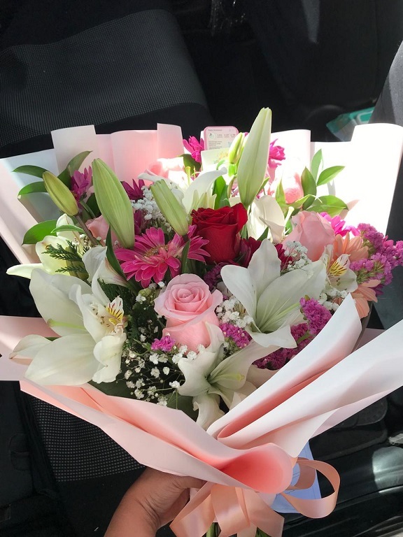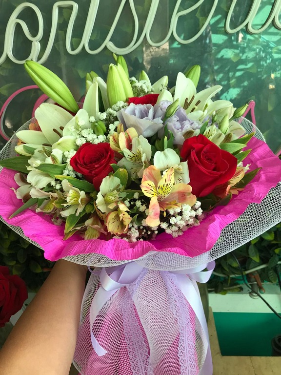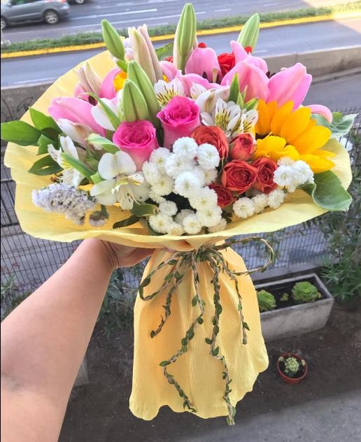 Ramo primaveral 3 varas liliuns, 3 varas lisianthus, 3 rosas, papel crepé y cinta cáñamo.