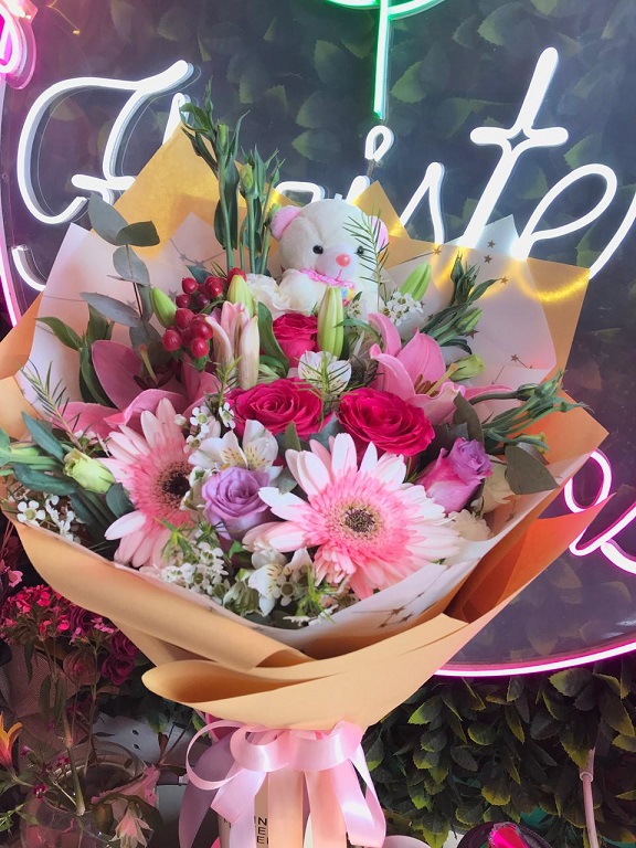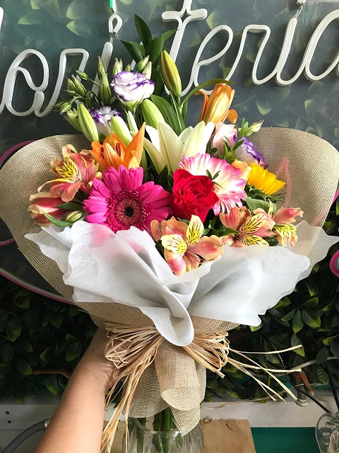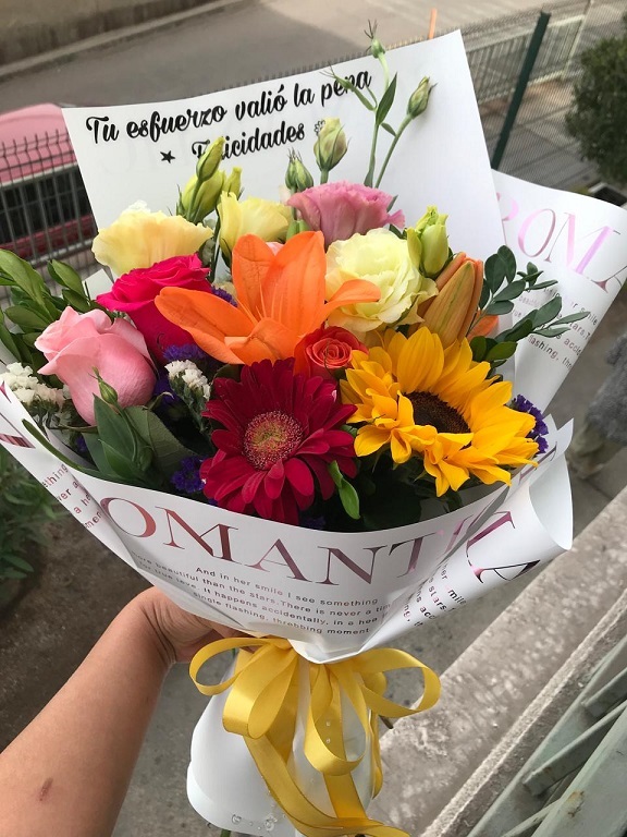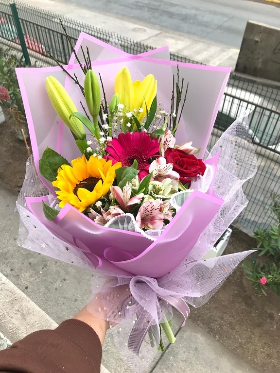 Ramo primaveral, 5 gerberas, 2 varas liliuns, 2 vara lisianthus, 1 girasol, crepé y malla.