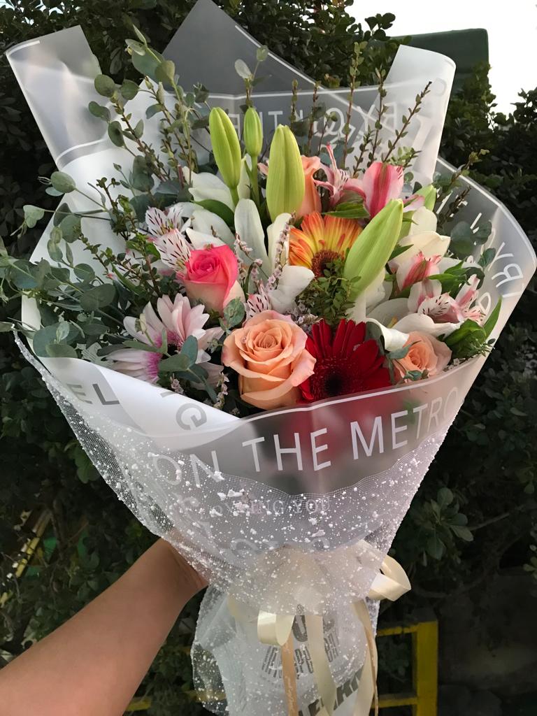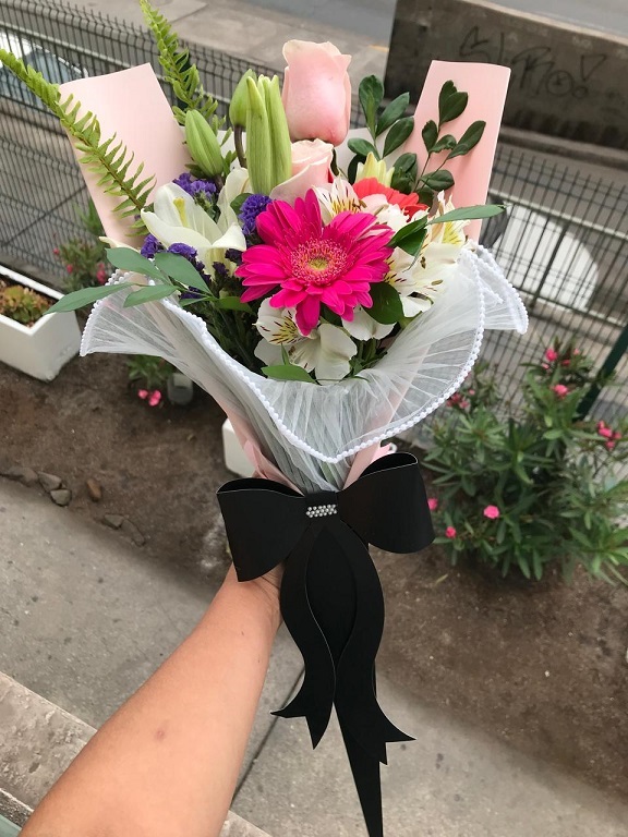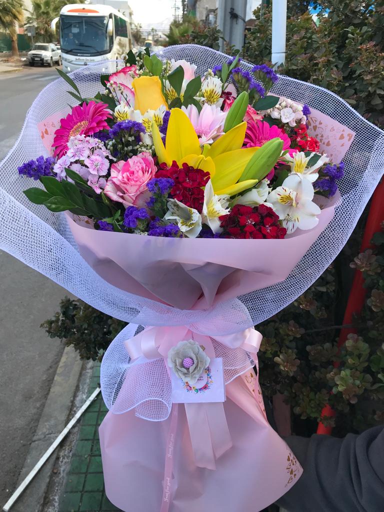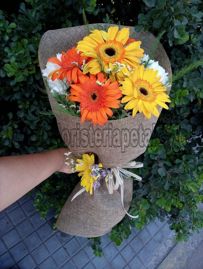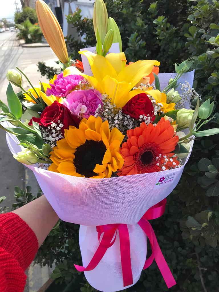 Ramo primaveral, 5 gerberas, 2 varas liliuns, 2 vara lisianthus, 1 girasol, crepé y malla.