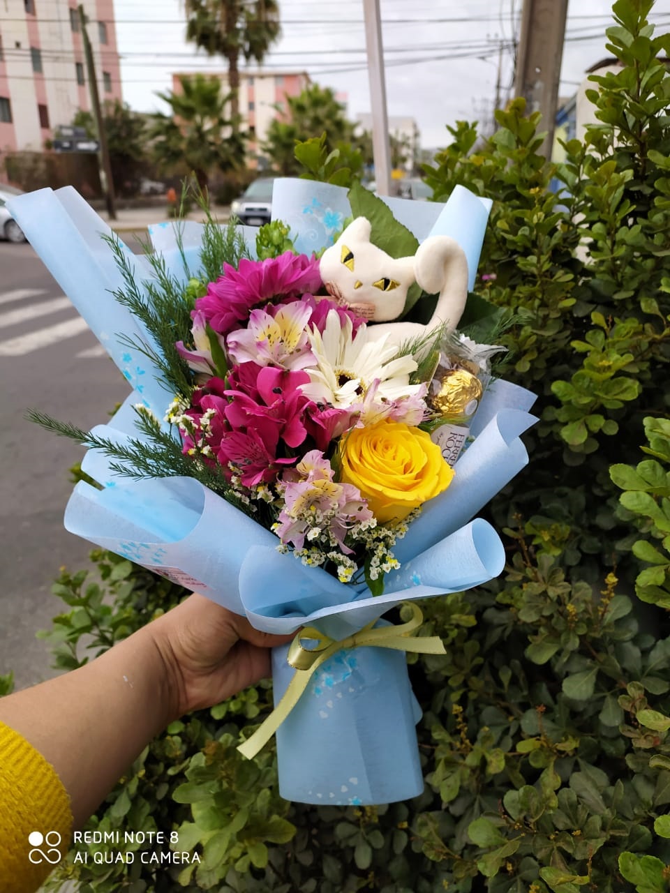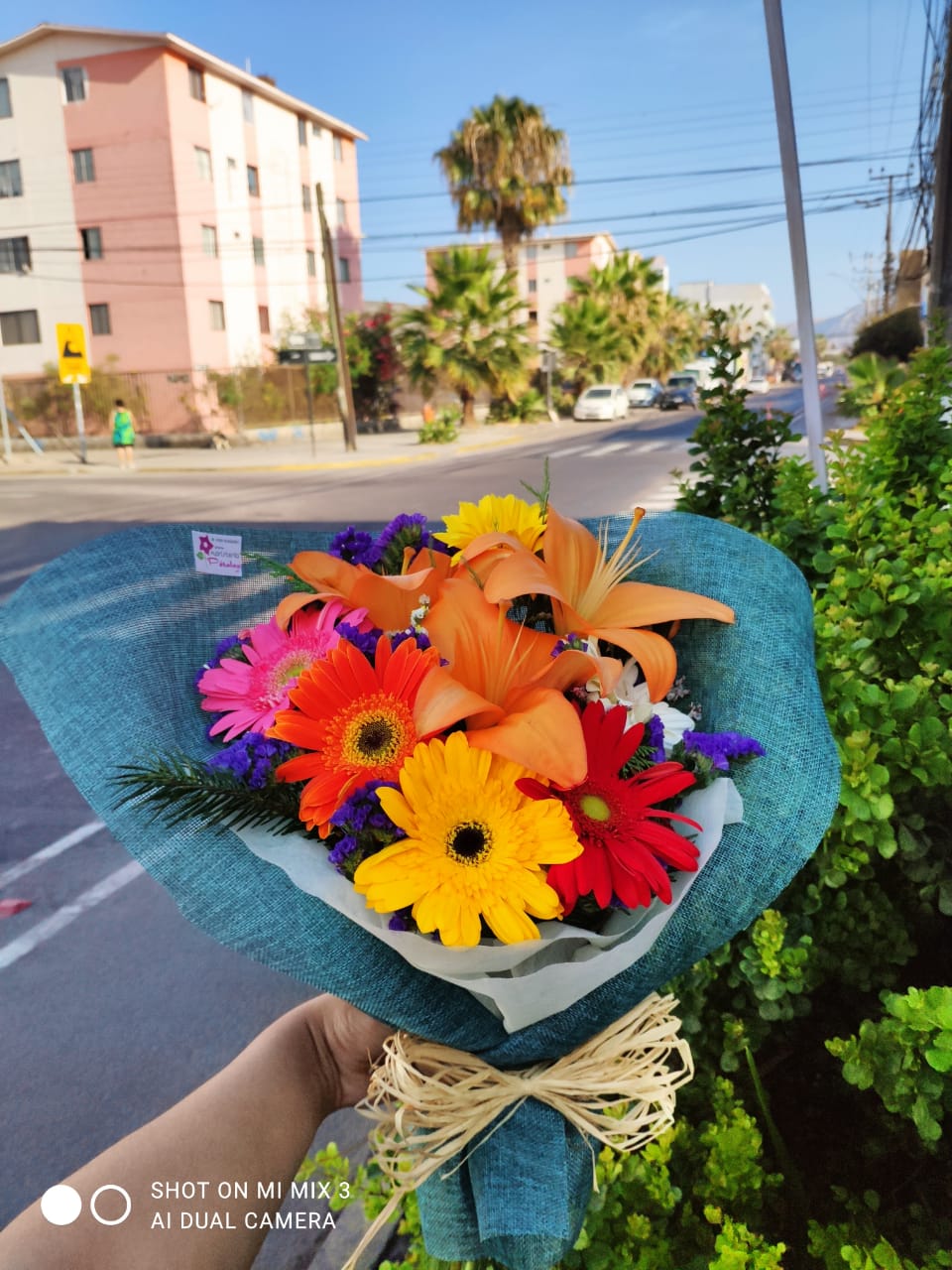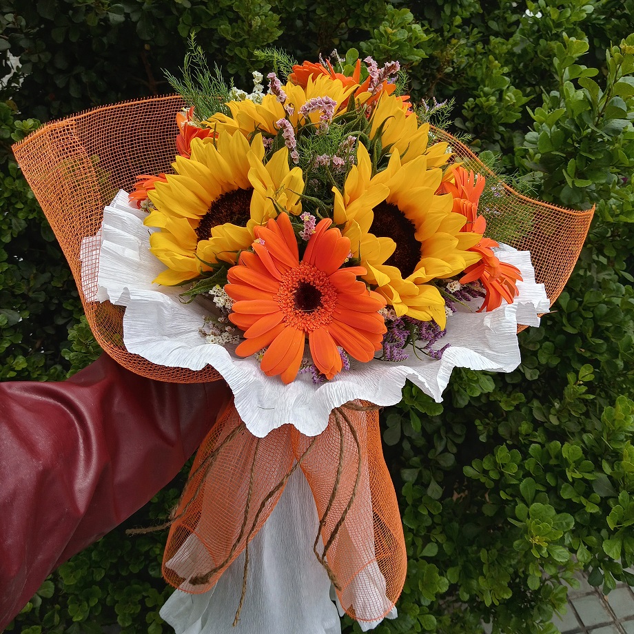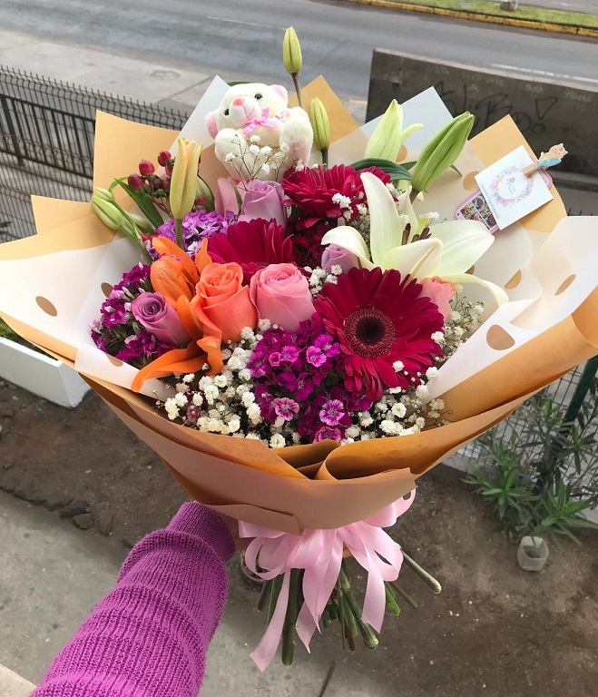 Ramo primaveral, 5 gerberas, 2 varas liliuns, 2 vara lisianthus, 1 girasol, crepé y malla.