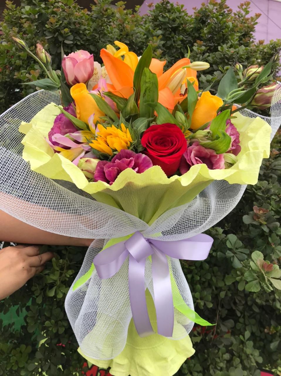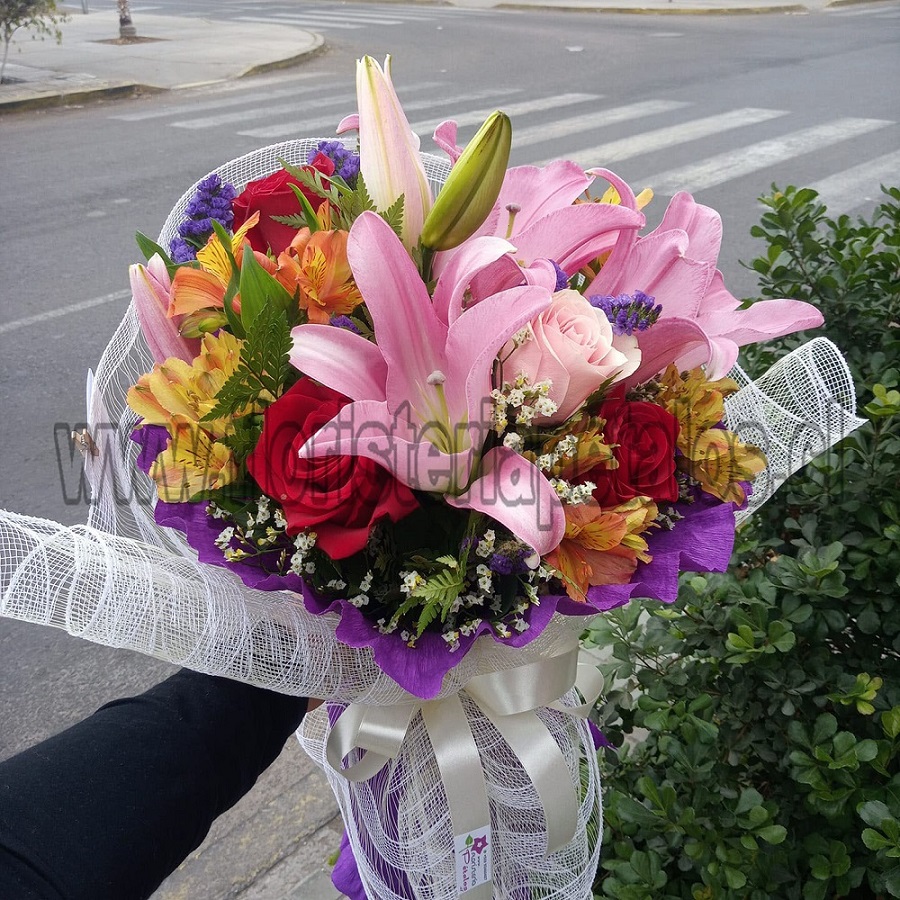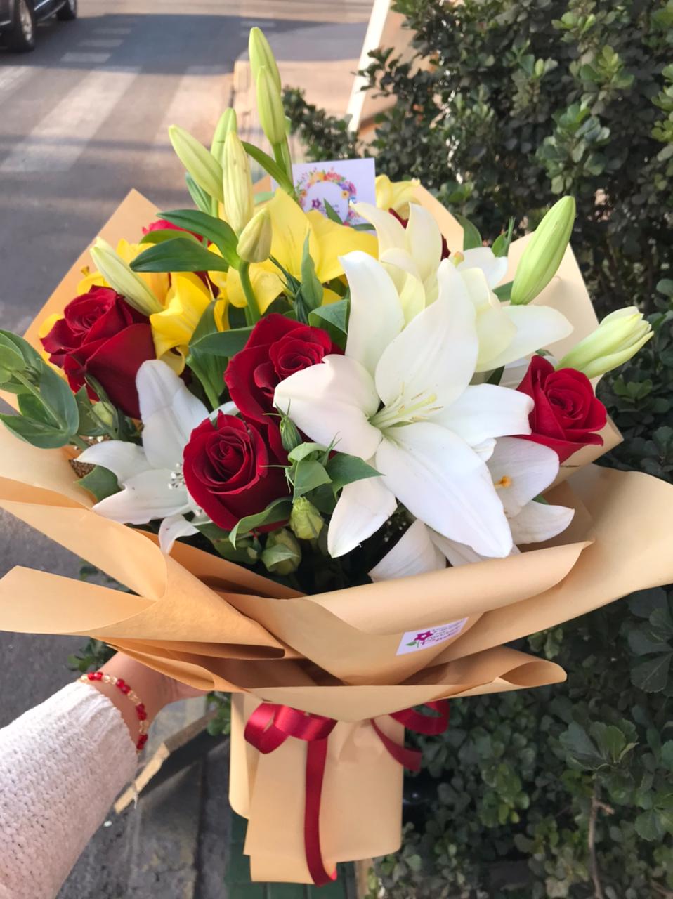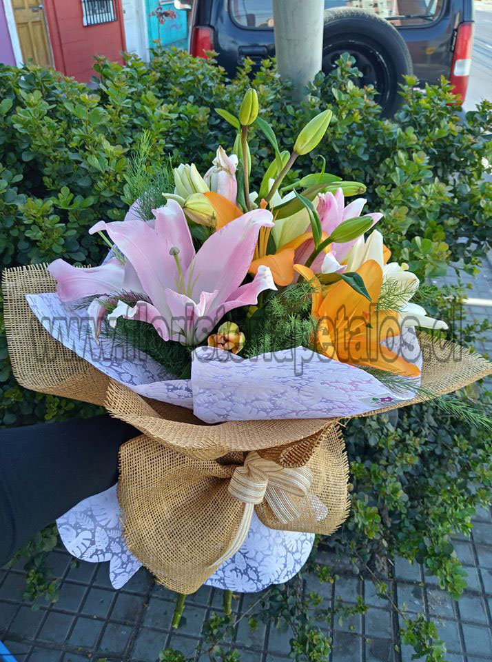 Ramo primaveral 3 varas liliuns, 3 varas lisianthus, 3 rosas, papel crepé y cinta cáñamo.
