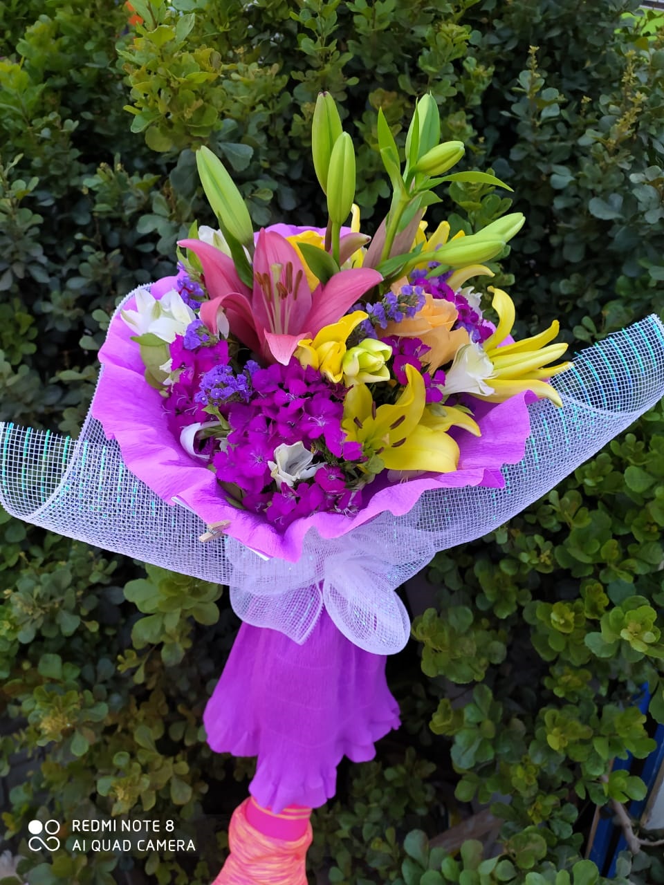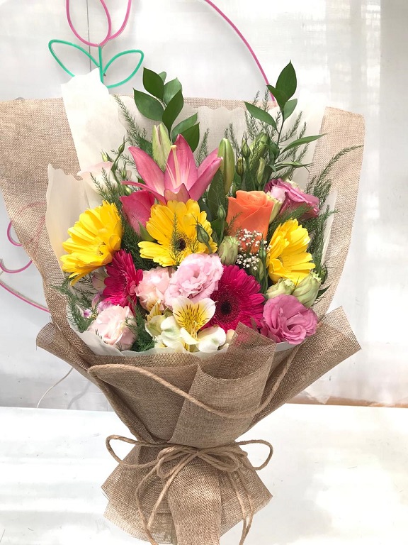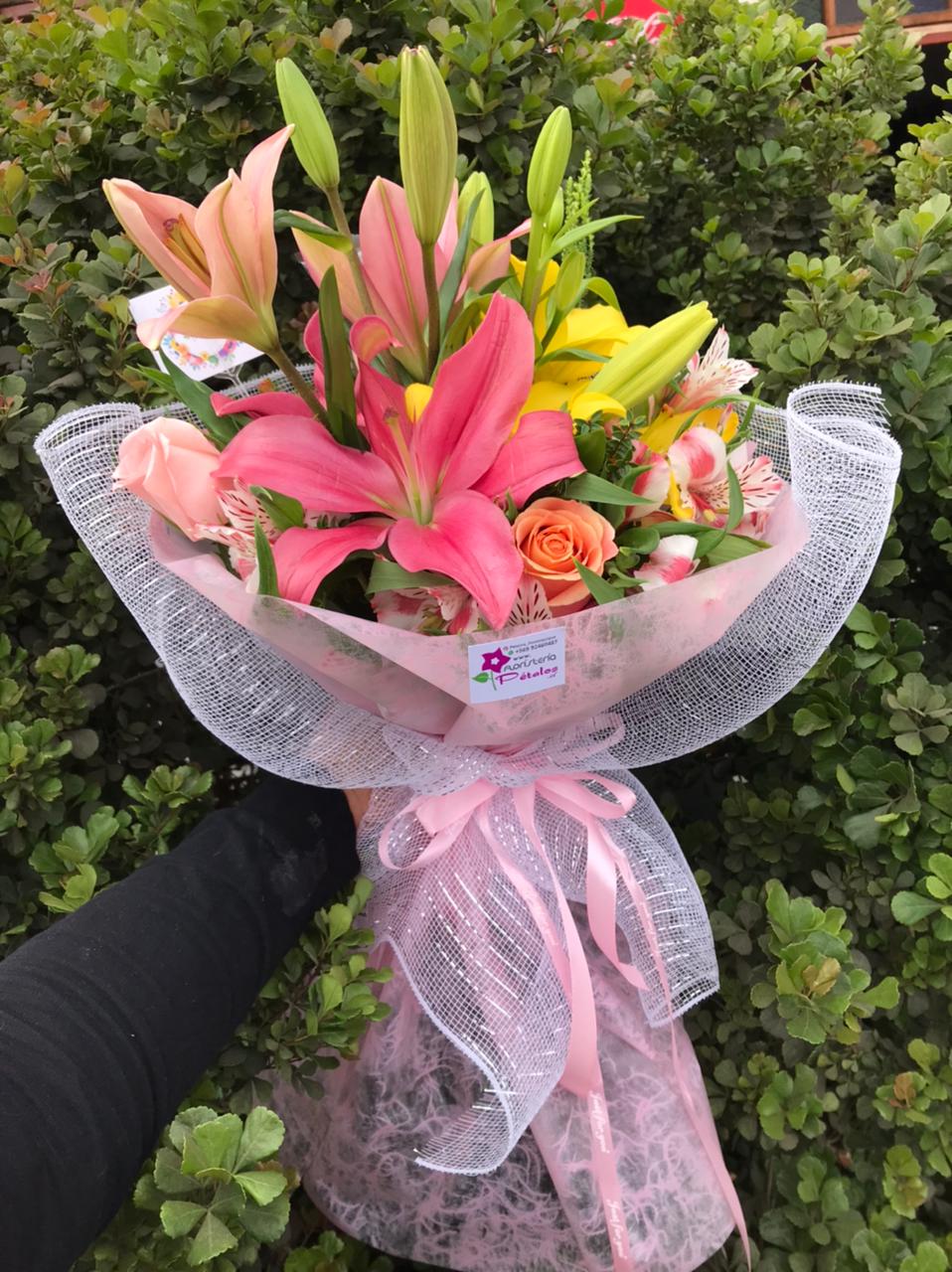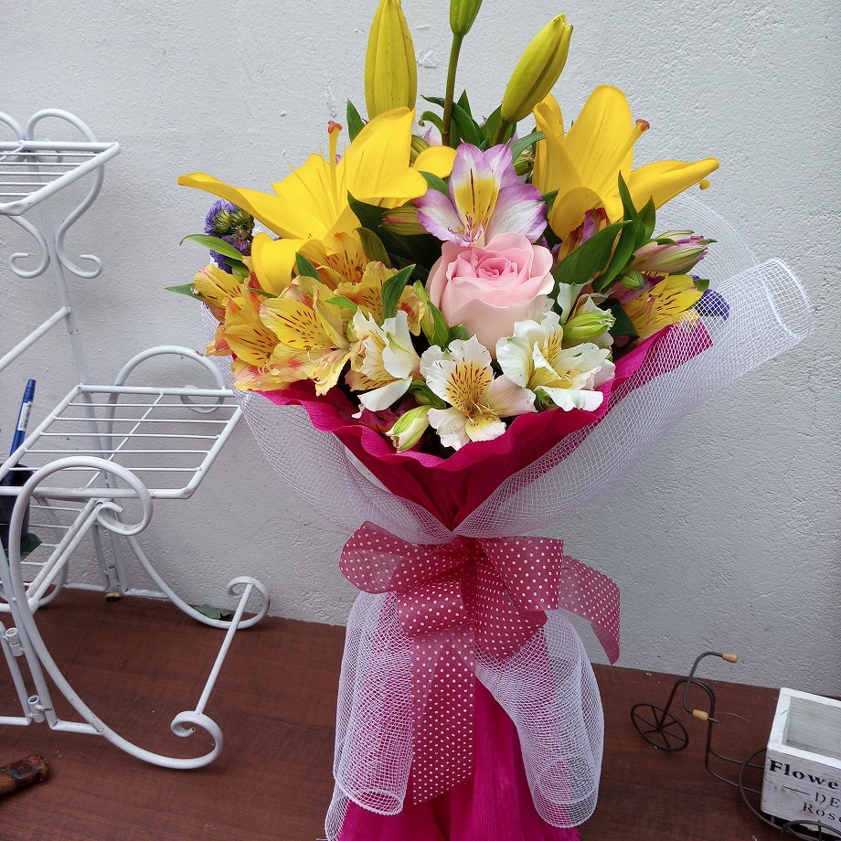 Ramo primaveral 3 varas liliuns, 3 varas lisianthus, 3 rosas, papel crepé y cinta cáñamo.