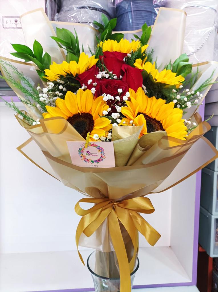 Ramo primaveral, 1 vara liliuns, 4 rosas, 3 varas lisianthus, 1 girasol, y decorado.